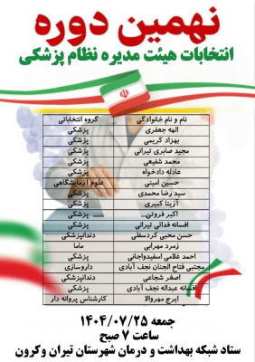 اسامی کاندیداهای نهمین دوره انتخابات هیئت مدیره نظام پزشکی 🇮🇷منتظر حضور پر شور همکاران گرامی (پزشک، دندانپزشک، داروساز، ماما، آزمایشگاهی و سایر گروههای پروانهدار) در انتخابات هیئت مدیره نظام پزشکی شهرستان هستیم🇮🇷