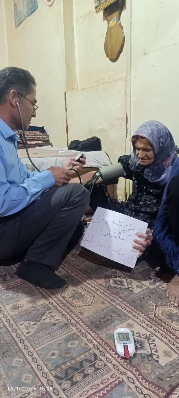 عیادت و ویزیت سالمندان در روستای حسین آباد 🔹در تاریخ ۱۳ مهر ۱۴۰۴، با حضور خانم دکتر ایزدی پزشک مرکز افجان و آقای نادری بهورز روستای حسین آباد در منزل سالمندان این روستا، ویزیت رایگان و عیادت از سالمندان انجام شد.